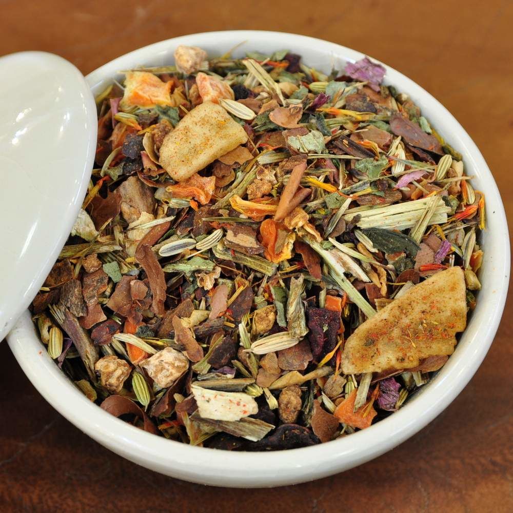 شاي الاعشاب: مصنوع من الأعشاب أو الفواكه أو البذور أو الجذور المنقوعة في الماء الساخن.
