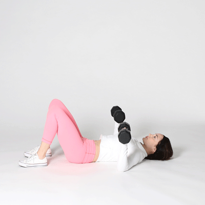 - أمسكي دمبل في كل يد وارفعي يديك بحيث يتماشيا مع كتفيك، مع إبقاء مرفقيك مثنيين.