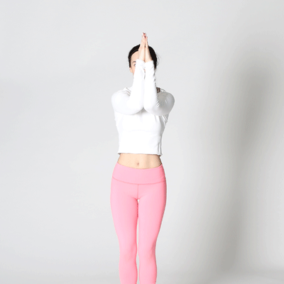 - اثني مرفقيك بزاوية 90 درجة واضغط على راحتي يديك تجاه بعضهما البعض أمام صدرك في وضع الصلاة لمدة 10 ثوانٍ ثم اتركيهم.