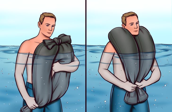 إذا تعرضت لضغط الماء الشديد ولا يوجد اي شئ تمسك به، ليس عليك سوى ان تلف سروالك حول رقبتك وتربط القدمين معًا حتى يساعدك على الطفو فوق الماء.