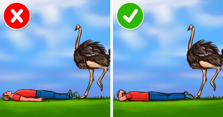 إذا تعرضت لهجوم من النعام على سبيل المثال يمكنك التظاهر بأنك ميت حتى تبتعد عنك بان تستلقي على بطنك وغطي رأسك بيديك ولا تستلقي على ظهرك للتظاهر بأنك ميت.