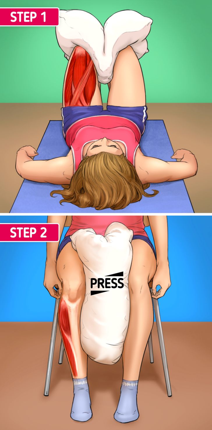 2)- استلقي على ظهرك وضعي وسادة بين ركبتيكِ ادفعي جسمك من الناحية السفلى لاعلى وارفعي منطقة الحوض واضغطي بركبتيكِ على الوسادة. كرري التمرين 20 مرة مع العمل على استرخاء منطقة الحوض وضم ركبتيكِ لمنطقة الصدر.