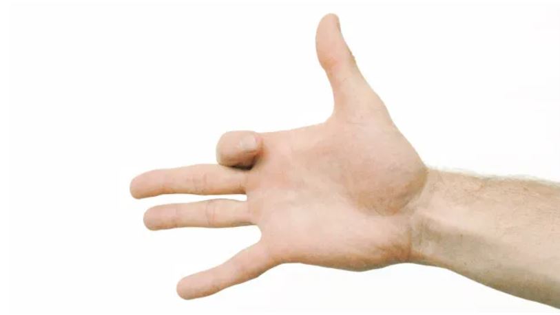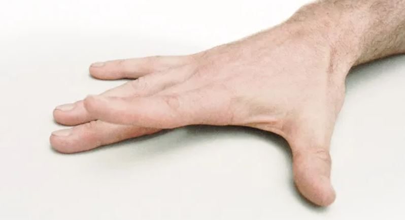 قم ببسط يدك بشكل مستقيم أيضًا في هذا التمرين وقم بثني الابهام للداخل نحو راحة اليد وحاول الوصول بالابهام للخنصر، إذا لم تستطع فلا تقلق فقط قم بمد الابهام بقدر ما تستطيع.