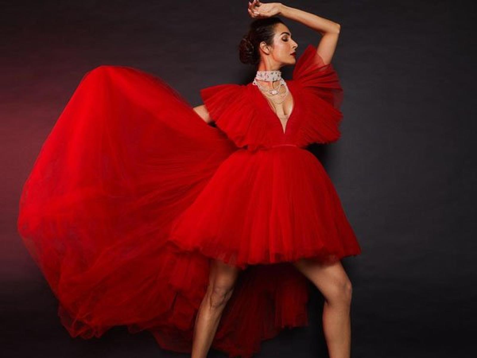 ماليكا أرورا: بدت الممثلة الهندية ماليكا أرورا كقطعة من النار حيث ارتدت فستان من تصميم تانيا غافري، من التل باللون الاحمر مع اكمام عريضة مكشكشة وذيل يتجاوز طول الفستان وارتدت قلادات وأقراط من اللؤلؤ ورفعت شعرها على شكل كعكة منخفضة وبحمرة شفاه جريئة وظهرت كأميرة أو ملكة في الأساطير القديمة.