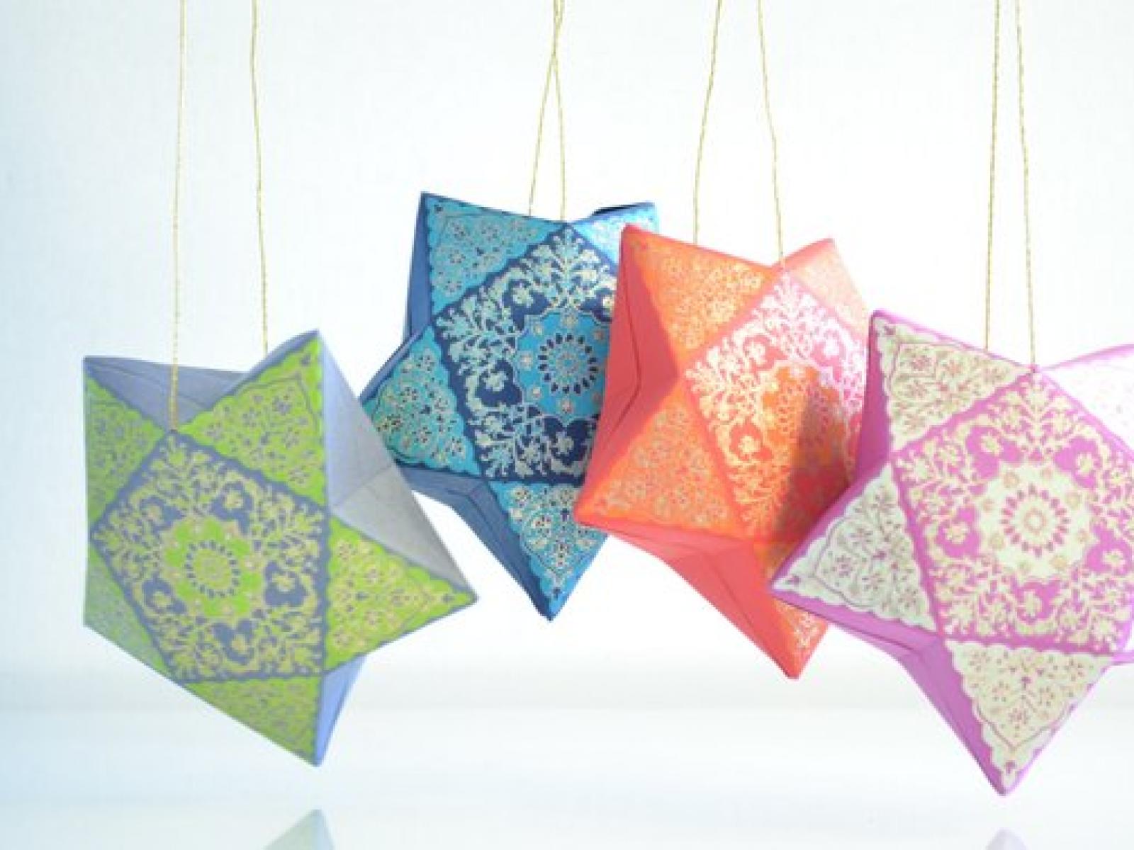 الزينة المصنوعة من الورق يدويًا وبتصميمات جذابة مثل صناديق النجوم المعلقة بسلسلة ذهبية، ويمكنك تعليقها في غرفك ولى الأبواب والنوافذك لتزيين المنزل في رمضان.