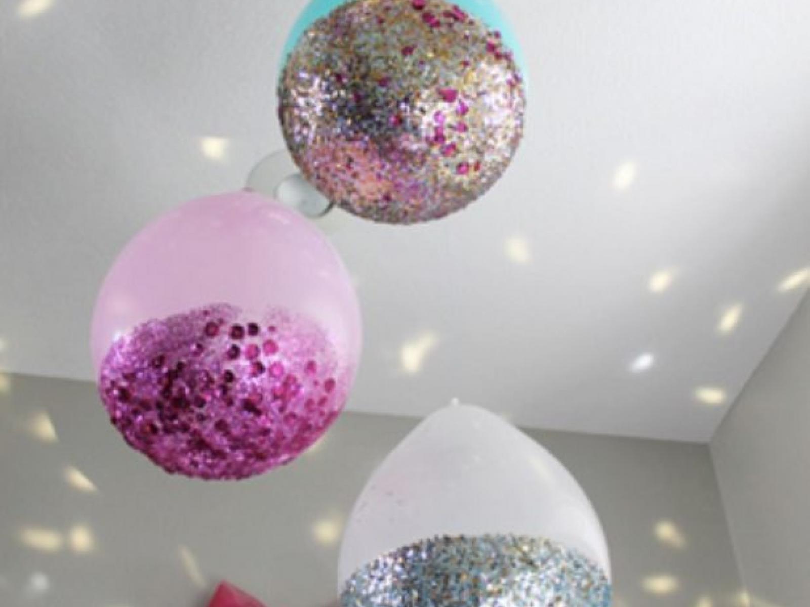 البالونات هي عناصر الديكور الرئيسية لأي احتفال إذ تضيف المزيد من المرح إليها، وإذا كنت تشعرين بالملل من البالونات العادية القديمة، فامنحيها مظهرًا أكثر إثارة لاستخدامها في الديكور الرمضاني. وأولاً، تحتاجين إلى نفخ البالونات ورسم الجزء العلوي منها بطبقة سميكة من الغراء باستخدام فرشاة طلاء، ثم اغمسي البالونات من النهاية المطلية في وعاء من الجليتر اللامع، وانتظري حتى تجف.