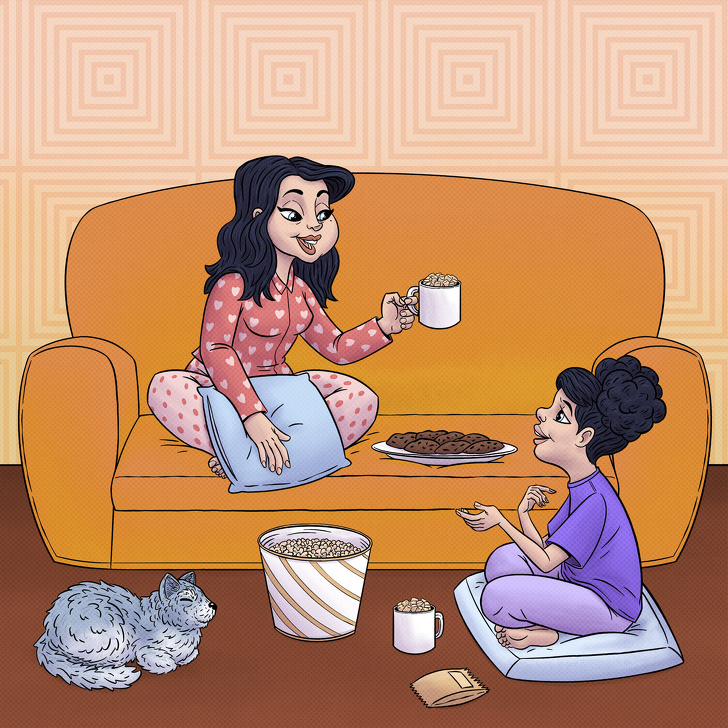 تعتبر الفتاة في هذه العلاقة الأم بمثابة الصديقة الحميمة التي تثق بها وتهرع للحصول على مشورتها إذا واجهت قرارًا او موقفًا صعبًا وتصبح الأم مُدرجة داخل حياه طفلتها بشكل كامل وتقع على عاتقها الإستشارة وحل مشاكل طفلتها كصديقة وشخصية الام الصديقة تؤدي لتربية فتيات لا يخشين المخاطر في المستقبل وعلى اتم الإستعداد لمواجهه التحديات ولديهن قدر عالٍ من التفاؤل والحب ويصبحون المبادرون في بدء اي علاقة إجتماعية ولديهم ثقة عاليه بأنفسهم فهم لا يخافون الرفض.