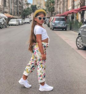 - بنطلون أبيض ممزوج برسومات ملونى وتوب أبيض وحذاء أبيض رياضي وإكسسوار شعر باللون الأخضر الفاتح.