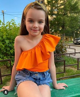 - بلوزة برتقالية وان شولدر وشورت أزرق جينز وبندانة للشعر باللون النحاسي