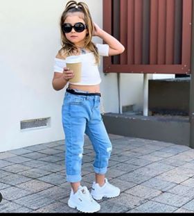 - بنطال جينز باللون الزرق وتوب أبيض قصير وحذاء رياضي أبيض.