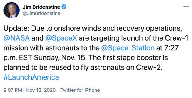 ونشرت عدة صحف مثل " بيزنس إنسايدر " و " ميرو " البريطانية، انه نقلًا عن وكالة ناسا ان المهمة الاولى التي يُطلق عليها اسم Crew-1،لفريق ناسا سبيس اكس المكون من رائد فضاء ياباني وثلاثة رواد امريكان والتي كان من المقرر ان تقلع من كيب كانافيرال ، فلوريدا، تم ارجاؤها ليوم الأحد بدلًا من السبت بسبب شدة الرياح وبعض التعزيزات التي قد تهدد سلامة العملية.