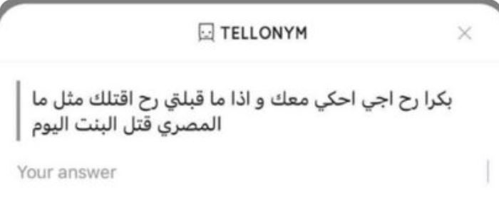اما الصادم فكان تداول تهديد واضح من القاتل للضحية، عبر تطبيق تقوم فكرته على الاعترافات، ويوضح التهديد الحب هو السبب وراء الجريمة، حيث ان الشاب قال في رسالته للضحية: "بكرا راح اجي احكي معك واذا ما قبلتي راح اقتلك متل ما المصري قتل البنت اليوم"
