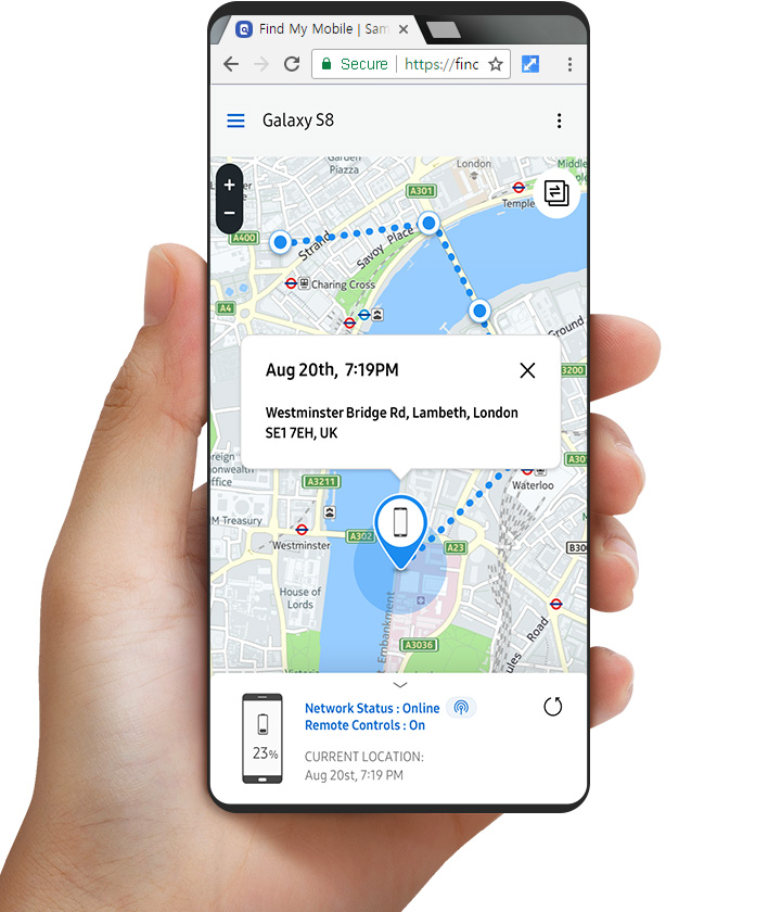وعلى غرار تطبيق Find My Device من غوغل، يتيح تطبيق Find My Mobile من سامسونغ للمستخدمين العثور على هواتفهم في حالة فقدها، بالإضافة إلى تحديد موقع هاتف غلاكسي المفقود عن بُعد، يمكنك أيضًا قفل الشاشة وحظر الوصول إلى Samsung Pay والنسخ الاحتياطي للبيانات المخزنة على الجهاز باستخدام التطبيق.