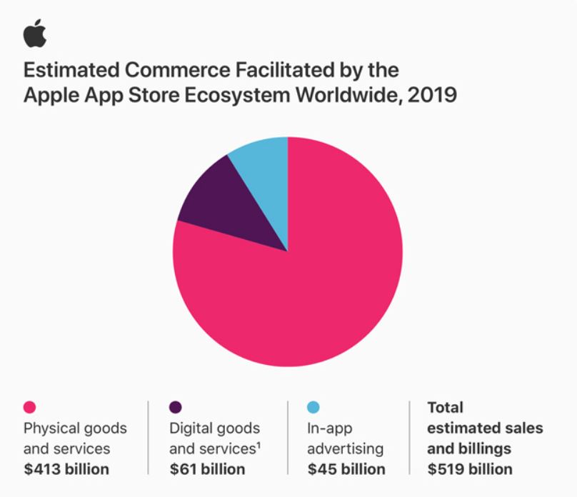 كشفت شركة آبل يوم الإثنين عن نتائج دراسة جديدة صادرة عن شركة استشارات اقتصادية تدعى "Analysis Group"، والتي جاء فيها أن متجر آبل استطاع أن يحقق 519 مليار دولار مبيعات للمنتجات والخدمات الرقمية خلال عام 2019.