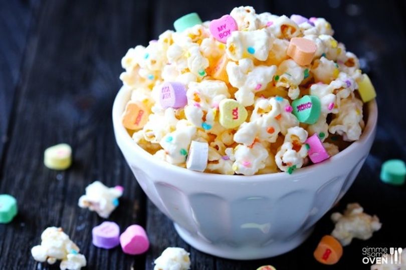يمكنكِ إعداد الفشار مع طفلك، فهي وجبة خفيفة سريعة وغير مكلفة لتحضيرها معًا، تأكدي من إضافة القلوب والألوان إعطاء شكل مميز.