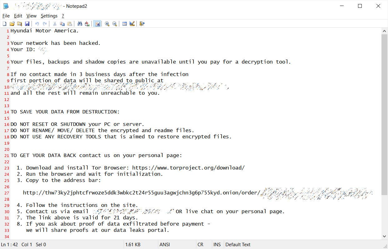 بحسب التقارير ترك المخترقون رسالة بعد اختراق النظام بفيروسات الفدية، موجهة إلى هيونداي موتورز أمريكا، والتي تذكر أن البيانات قد تم تشفيرها، وتطلب من الشركة دفع فدية من خلال رابط مرفق في الرسالة خلال 21 يومًا.