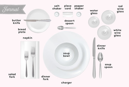 يتضمن إعداد المائدة الرسمي العديد من القطع: مفرش طاولة، أطباق العرض، أطباق العشاء، أوعية ، أطباق سلطة، أطباق خبز، مناديل، شوك سلطة، شوك عشاء، سكاكين، ملاعق شوربة، سكاكين زبدة، ملاعق حلوى، أكواب ماء، أكواب مختلفة للمشروبات.