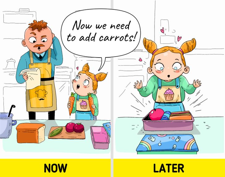 اوكلي مهمة تحضير صندوق الغذاء لطفلك اجعليه يقرر مقدار الكمية التي يحتاجها من الطعام طوال اليوم ومن هنا يتعلم مهارة التخطيط.