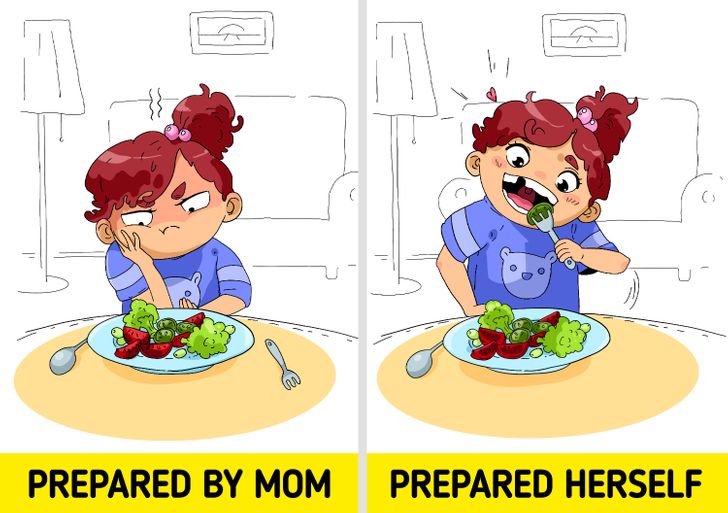 يحب الأطفال الذين يشاركون الأعمال المنزلية تناول الخضروات والفاكهة وأي اطعمة صحية كما انهم يحافظون على وجبة الافطار ولا يميلون لتخطيها ابدًا.