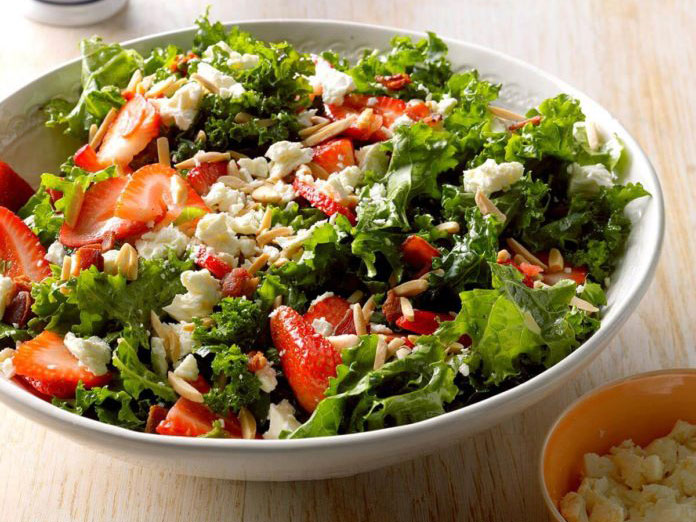 تمنح شرائح الفراولة والكالي والنعناع الطازج إحساسًا صيفيًا إضافيًا، ويمكن إضافة اللحم المقدد واللوز المحمص لمزيد من القرمشة ونكهة مثالية.