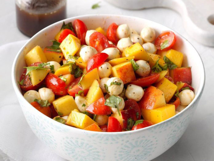 يضاف الخوخ والعسل إلى سلطة كابريزي الكلاسيكية لنكهة حلوة ولذيذة للصيف، وتعتبر سلطة كابريزي طبق سلطة من المطبخ الإيطالي، تُحضّر من شرائح الطماطم الطازجة و شرائح الموتزاريلا والريحان وتتبل بملح الطعام وزيت زيتون.