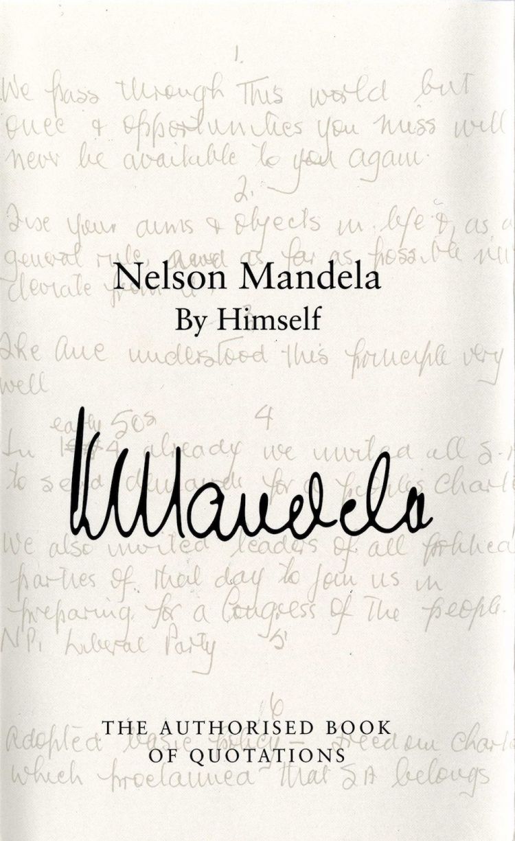 مجموعة من الأوراق الخاصة والخطب والتسجيلات الصوتية المنسوخة.. نيلسون مانديلا: يعرض أكثر من 2000 اقتباس تمتد لأكثر من 60 عامًا من حياته. تم تنظيم الكتاب في 300 فئة لسهولة الرجوع إليه، ويتناول قضايا "الشخصية" و "الشجاعة" و "التفاؤل" والمزيد.