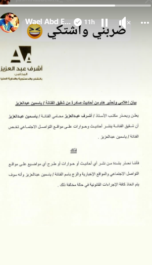 ومن جهته قام وائل عبد العزيز بنشر البيان عبر خاصية القصص المصورة على حسابه الرسمي على "فيسبوك" وعلق عليه "ضربني واشتكى". ويبدو أن هذا البيان سيكون نهاية الخلاف المعلن على السوشيال ميديا منعًا للخوض أكثر في المشاكل العائلية للفنانة ياسمين عبد العزيز.