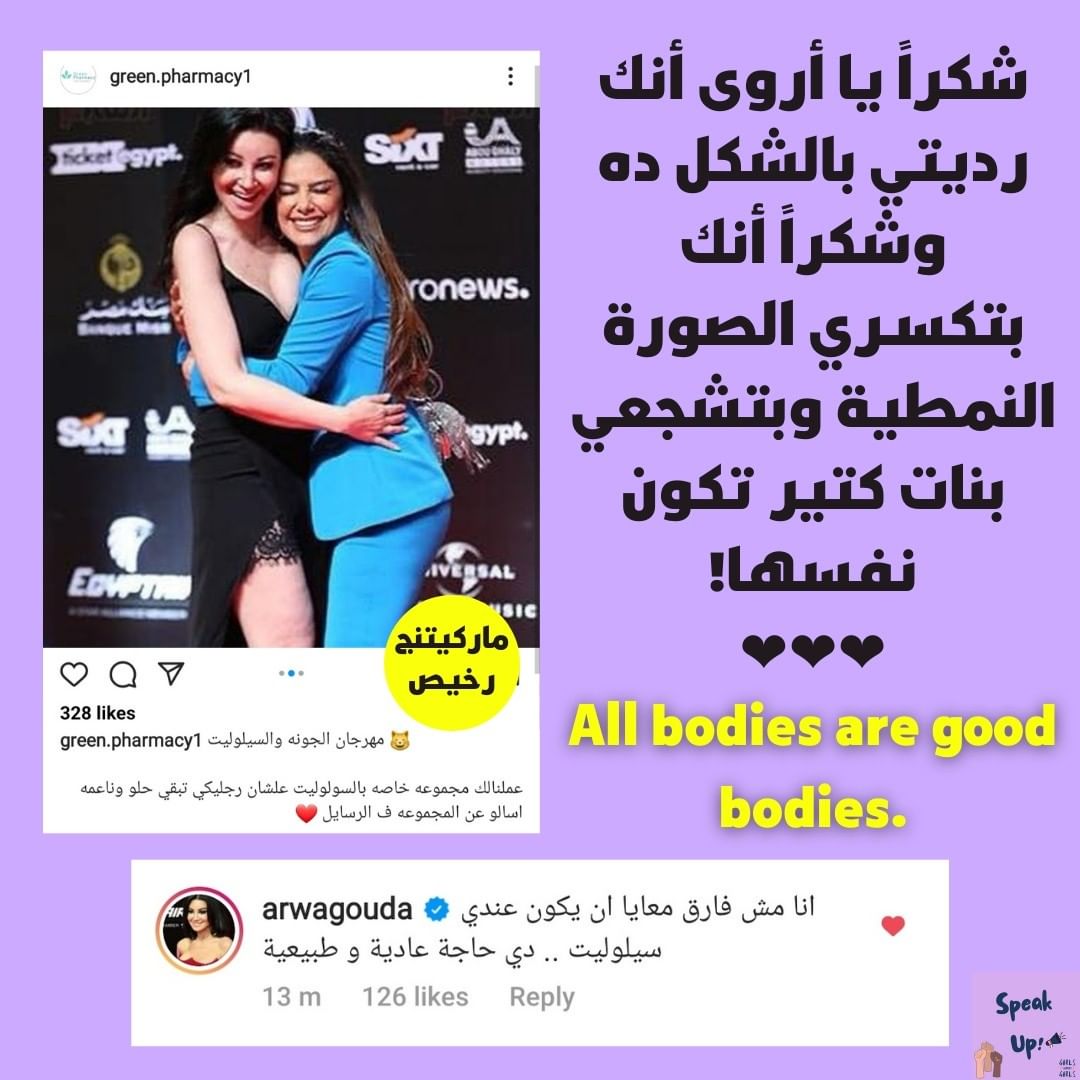 أثارت إحدى الصفحات التابعة لصيدلية في مصر جدلًا واسعًا بعد استخدامها صورة إطلالة الفنانة المصرية أروى جودة من أجل الترويج لمنتج عن السيلوليت.
