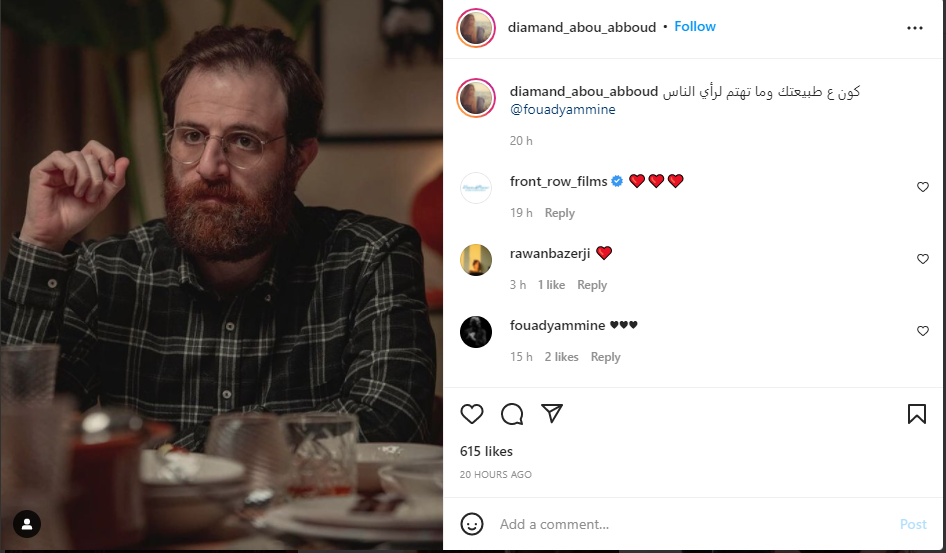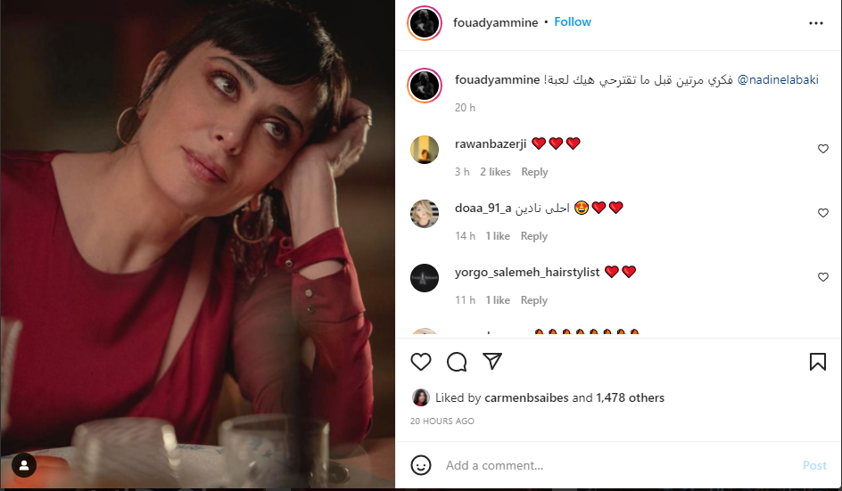 وبدوره ينشر فؤائد يمين صورة الفنانة اللبنانية نادين لبكي ويعلق عليها: "فكري مرتين قبل ما تقترحي هيك لعبة!".
