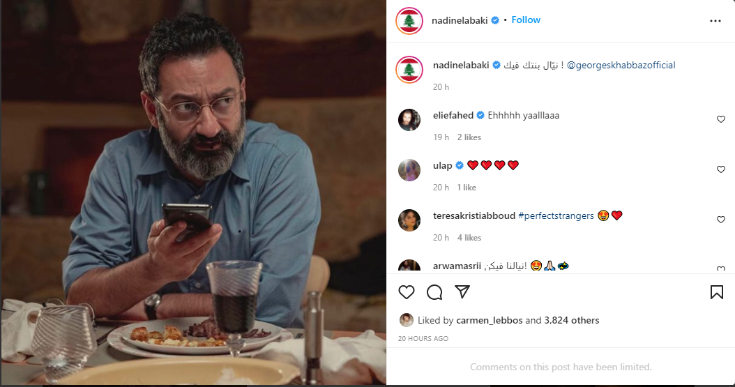 بينما تمدح نادين لبكي زميلها الفنان اللبناني جورج خباز وتقول له: "نيّال بنتك فيك".