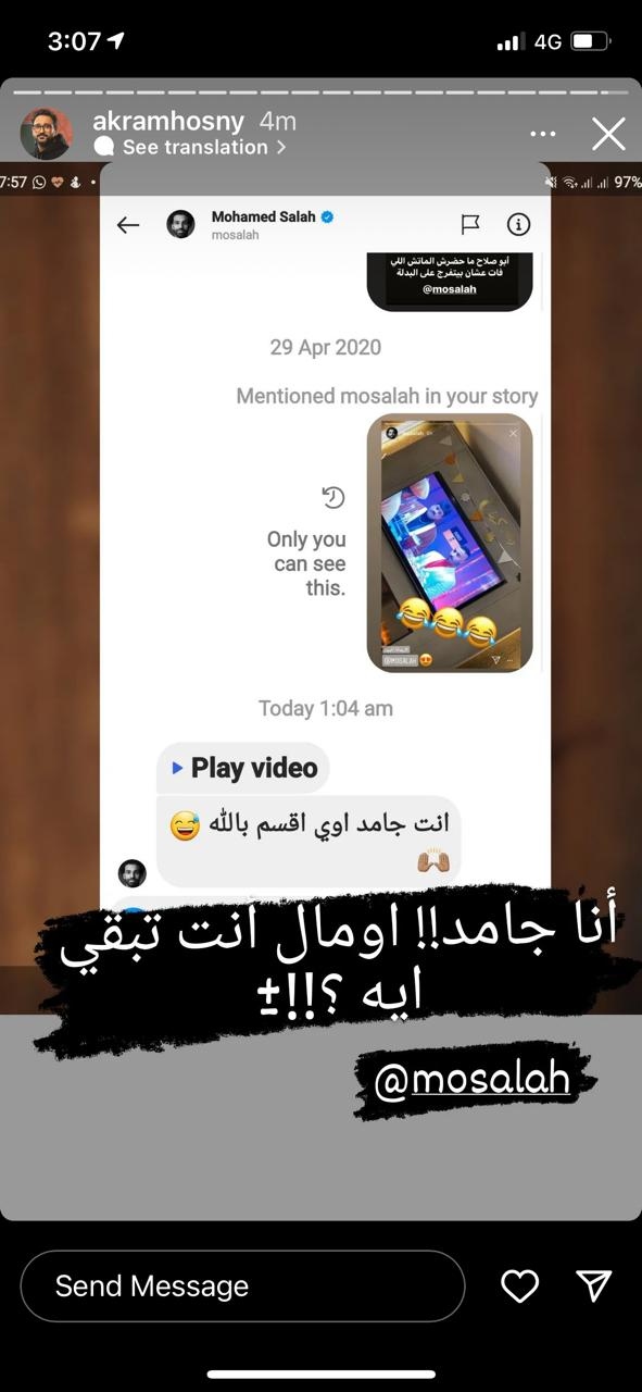 وأرسل محمد صلاح تعليقًا على سؤال الفنان المصري وقال: "أنت جامد أوي أقسم بالله"، ورد أكرم على صلاح: ""أنا جامد!! أومال أنت تبقى إيه؟!!".