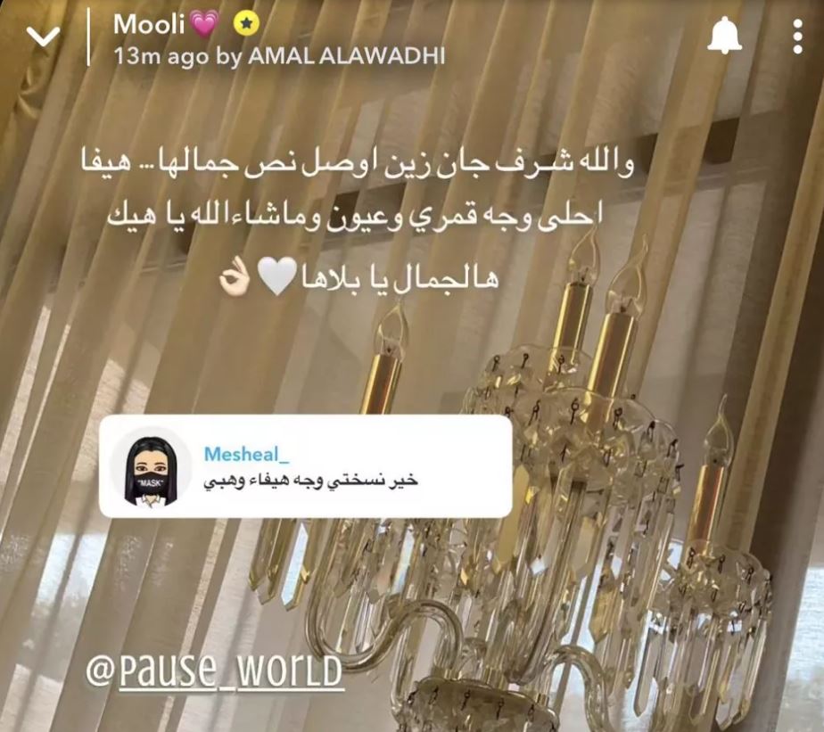 ردت الفنانة الكويتية أمل العوضي على متابعة اتهمتها بنسخ شكل الفنانة اللبنانية هيفاء وهبي عبر حسابها الخاص على سناب شات، ونشرت العوضي تعليق متابعة جاء فيه: "خير نسختي وجه هيفاء وهبي"