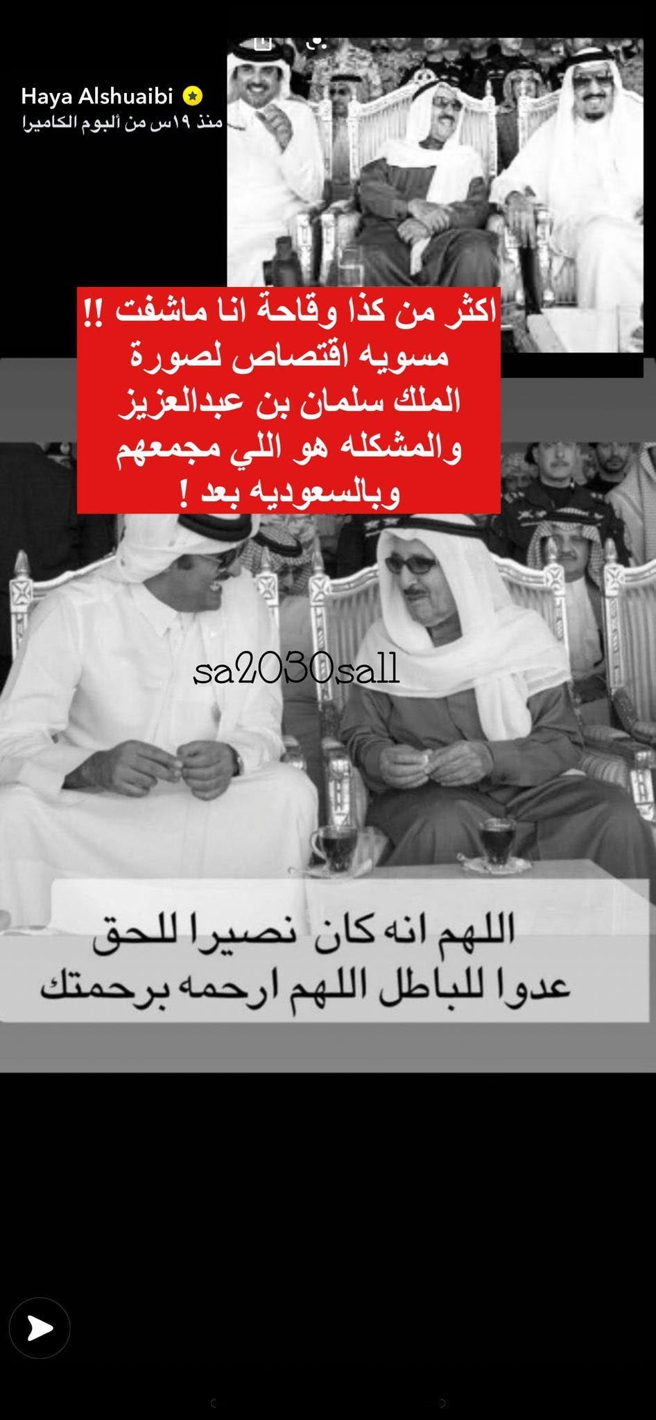 كما شاركت صورة أخرى قديمة لأمير قطر برفقة الشيخ الراحل من مناسبة كان السبب في تنظيمها العاهل السعودي الملك سلمان بن عبد العزيز، لكنها اقتطعت صورة العاهل السعودي، وأرفقتها بتعليق: "اللهم إنه كان نصيراً للحق عدواً للباطل اللهم ارحمه".