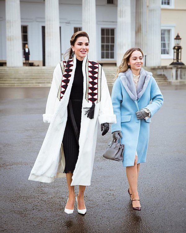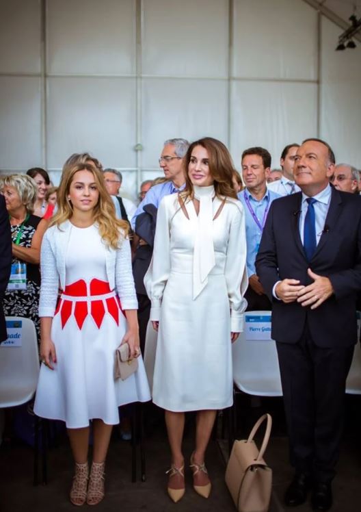 تألقت الأميرة الأردنية في إحدى المناسبات مرتدية طقم مكون من بليزر وبنطلون باللون البيج مع حزام بنقشة السدو البدوية، وحذاء باللون البيج وامسكت حقيبة كلاتش وتركت شعرها منسدلًا، وظهرت في الصورة إلى جانب والدتها الملكة رانيا التي تألقت بثوب باللون الأبيض