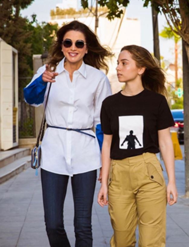تظهر الأميرة الحسناء في هذه الصورة إلى جانب والدتها الملكة رانيا وقد اعتمدت اطلالة كاجوال، مرتدية تيشيرت وبنطلون جينز باللون الأبيض، وتركت شعرها منسدلًا مع رفعه بنظارة الشمس