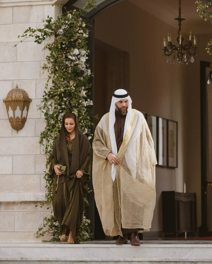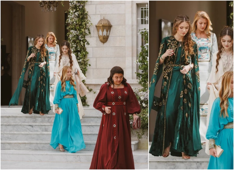 وتألقت الأميرة هالة بثوب مكون من قطعتين باللون الزيتي، من علامة الازياء الشهيرة شالكي، وجاء الثوت بقطعة سفلية على شكل فستان "كيب" مع اكمام طويلة من الشيفون مطرزة بالخيوط الذهبية.