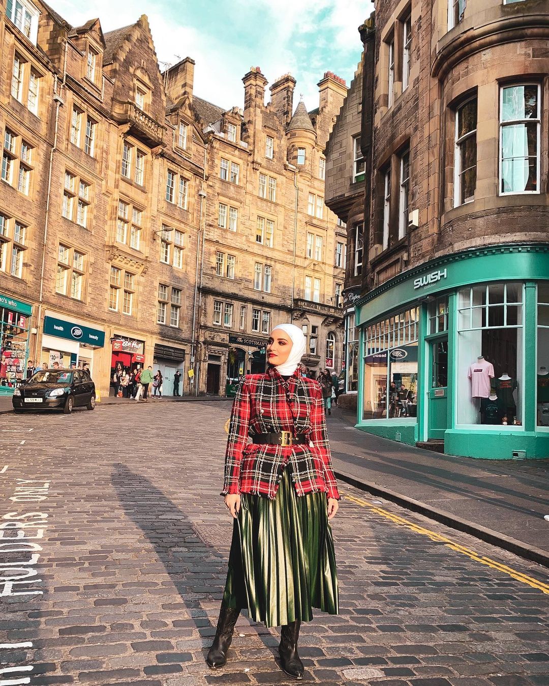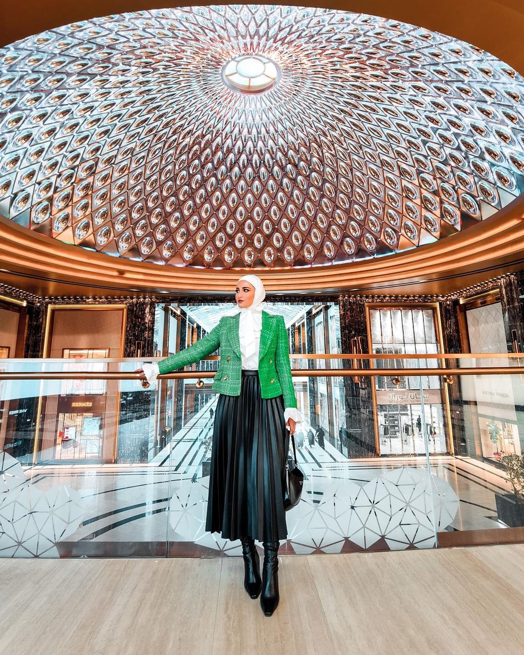كما نسقت تنورة البليسيه ذات الجلد الأسود مع الجاكيت الأخضر التويد، واختارت بلوزة كلاسيكية، لإطلالة سيمي كلاسيك مميزة للنهار.