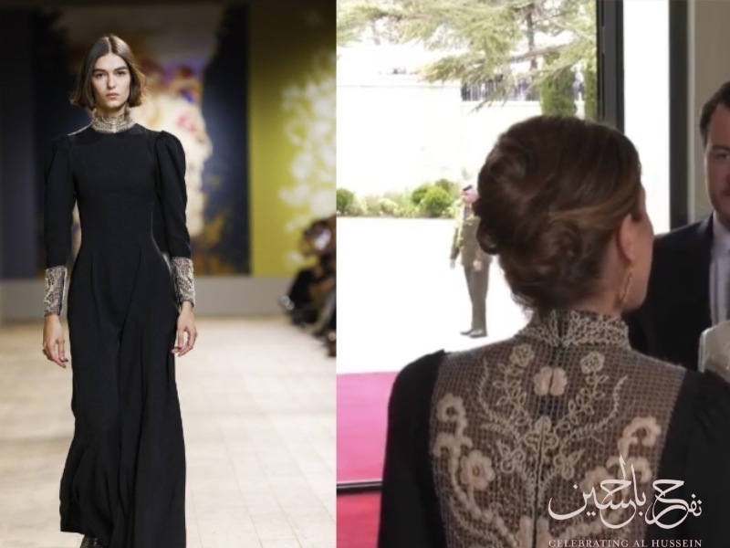 اختارت ملكة الأردن لهذه المناسبة فستان من دار الأزياء العالمية ديور من مجموعة خريف- شتاء 2022-2023 والتي أقيمت في متحف رودين في باريس، من تصميم ماريا غرازيا تشوري.