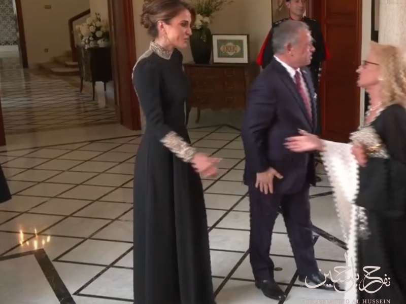 تألقت الملكة رانيا بفستان طويل باللون الأسود مع تطريزات باللون الذهبي على أطراف الأكمام ونقوش ذهبية على الظهر.