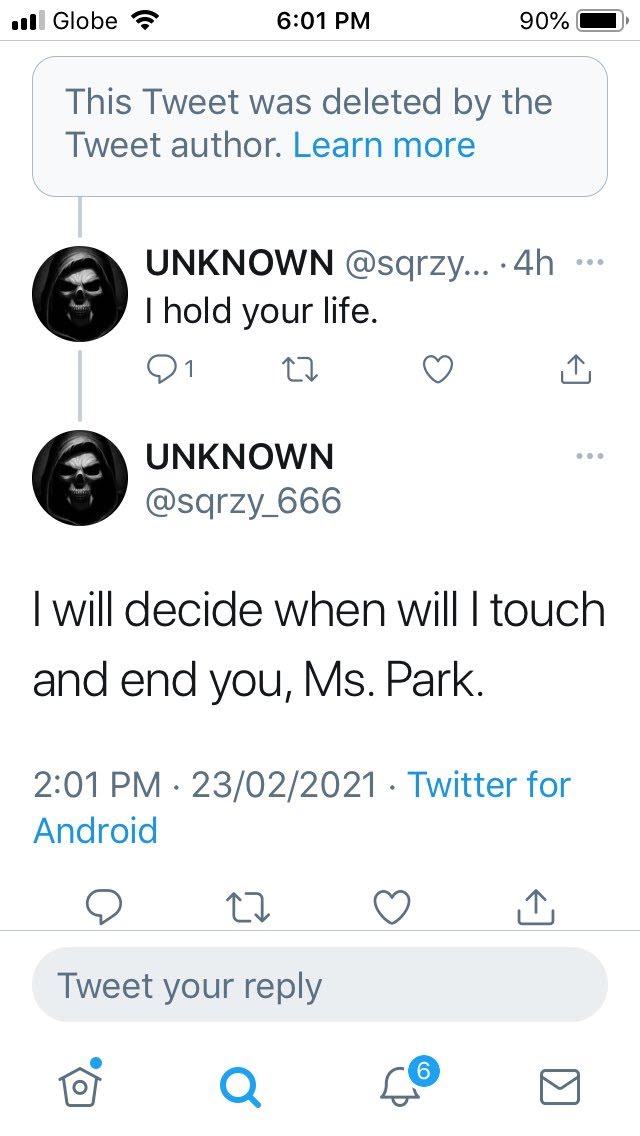 ووفقا لمجلتي "كوريا بوو" و"شي ذا بيبول"، تم الكشف عن التغريدات رغم تدخل إدارة تويتر لحذفها وتعليق الحساب، وتضمنت التغريدات تهديدات صريحة بالقتل، إذ قيل في أحدها: "سوف أقرر متى أقضي عليكِ آنسة بارك"، وتضمنت أخرى: "أنا أتحكم في حياتك".