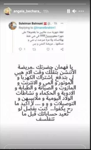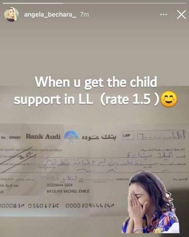 نشرت انجيلا بشارة طليقة الفنان اللبناني عبر خاصية "ستوري" على انستغرام، صورة لشيك وأوضحت أن هذا الشيك هو نفقة ابنتيها من طليقها. كما أوضحت أن الشيك بالليرة اللبنانية بوقت تشهد فيه عملة لبنان انهيار كبير.