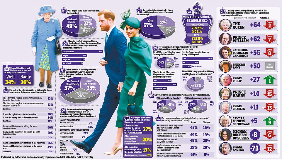 وأوضح الاستطلاع أيضًا أن النظام الملكي قد تضرر، فضلًا عن شعبية الملكة وتضررت أيضًا شعبية هاري وميغان وأصبحت الأخيرة الآن الأقل شهرة في العائلة المالكة بعد الأمير أندرو.