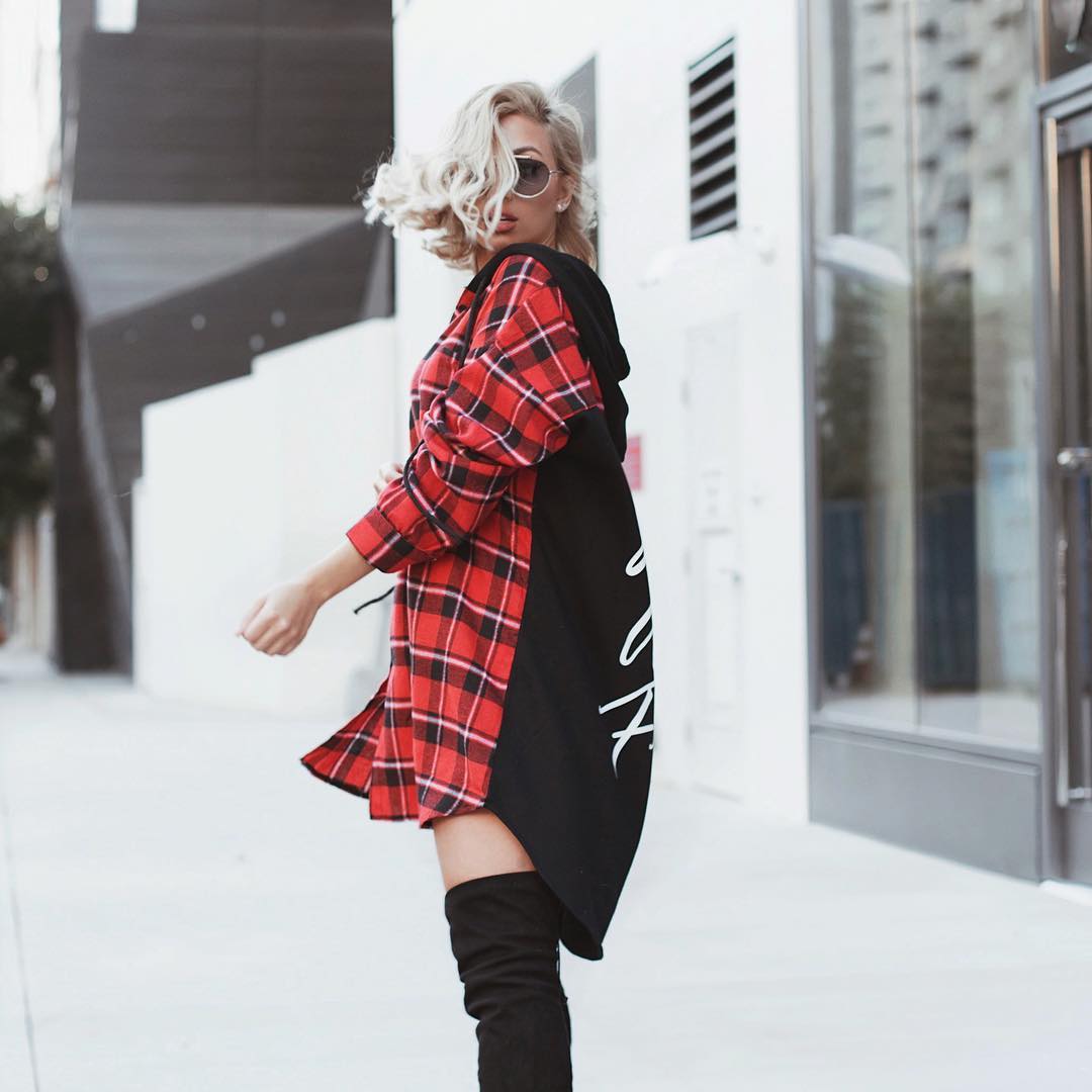 واعتمدت إطلالة كاجوال مُرتديةً بليزر كاروهات باللونين الأحمر والأسود، نسَّقته ببنطال جينز أزرق ضيِّق وتيشيرت أبيض.