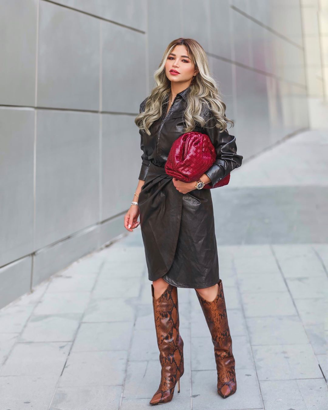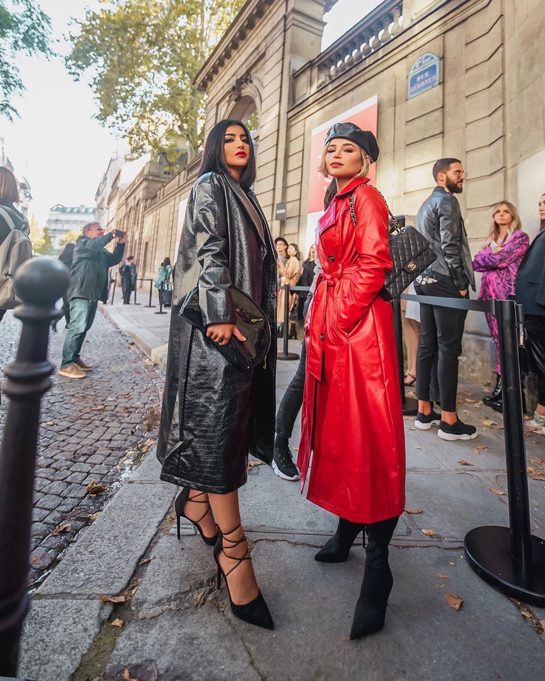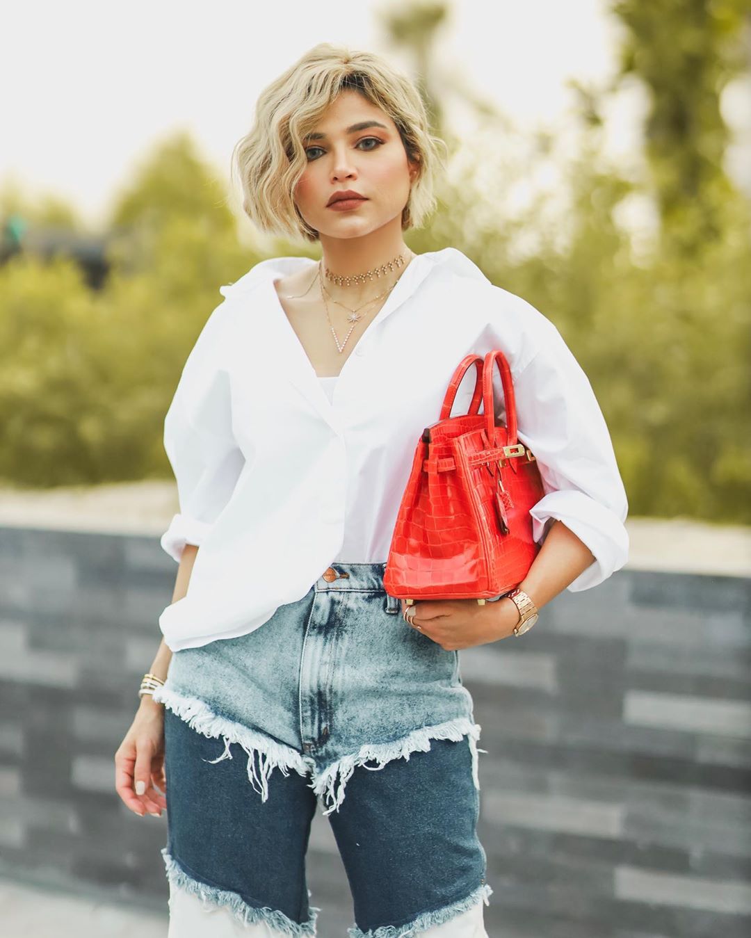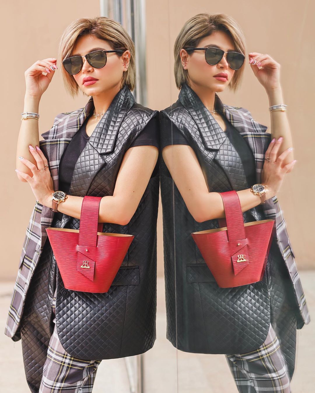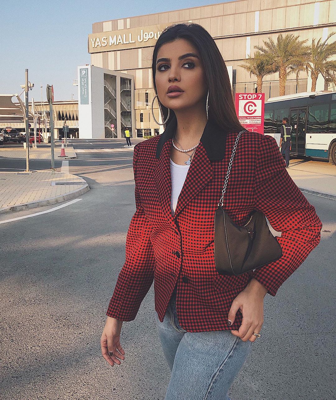اعتمدت الفاشنيستا الكويتية إطلالة مزجت بين الكلاسيكية والعصرية، مُرتدية معطف أحمر متوسط الطول مُزيَّن بأزرار سوداء نسَّقته بشورت قصير فضفاض أحمر، كما انتعلت حذاء من الجلد الأسود ذي ياقة عالية، وحملت حقيبة يد بيج مُخططة بدرجات اللون الأحمر من العلامة التجارية "شانيل".