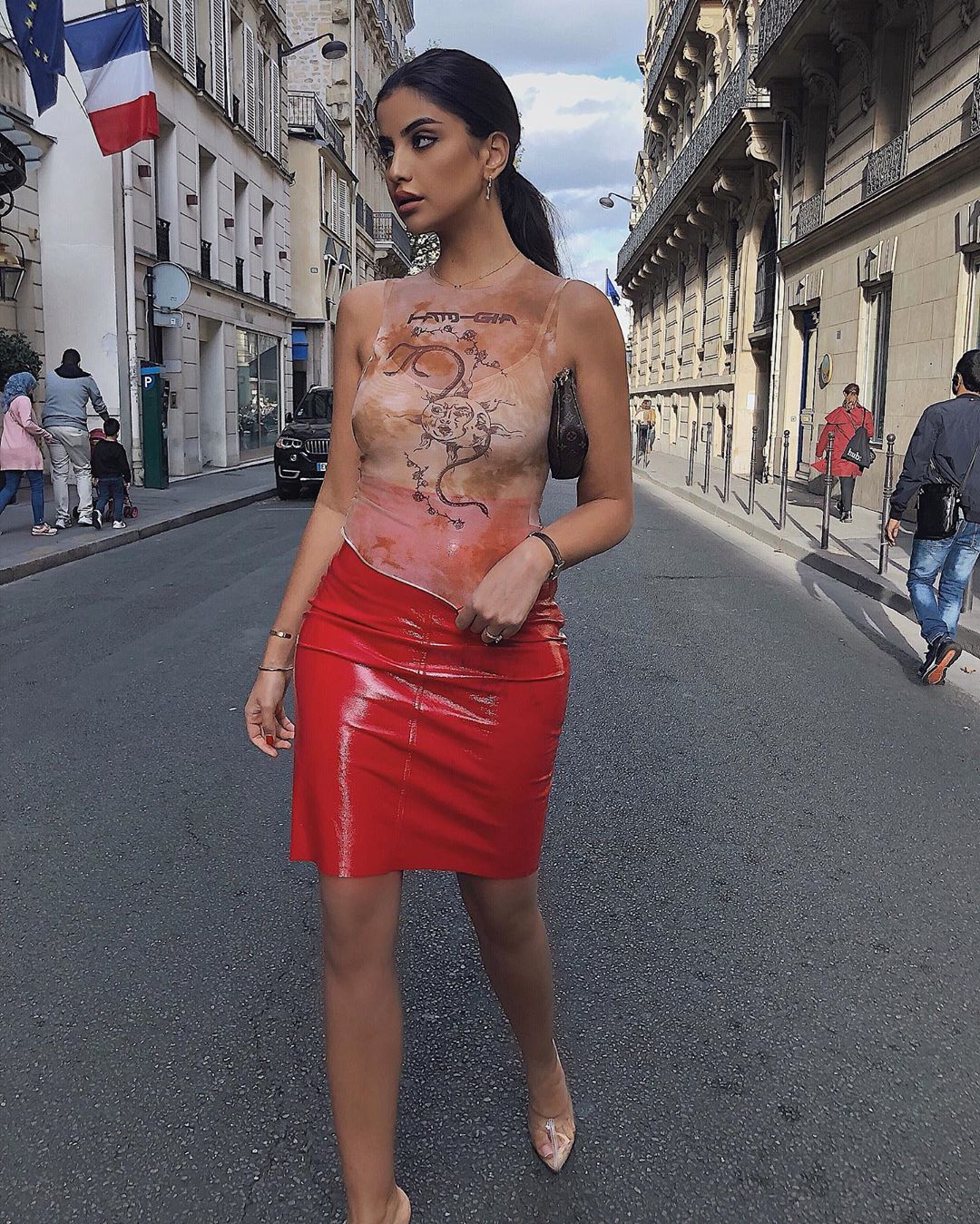 ويعتبر الجلد من صيحات عام 2020 الجديدة، لهذا تألَّقت مُرتدية تنورة جلد حمراء نسَّقتها بتوب شفاف نود وبروتيل بلون البشرة.