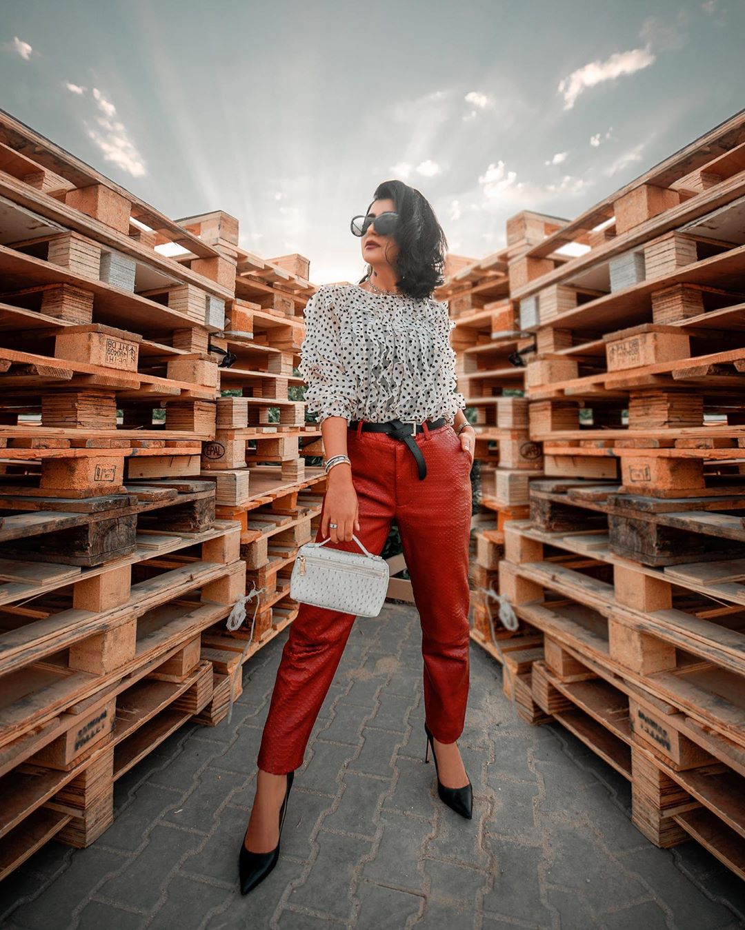من جهة أخرى، تألَّقت بقميص بولكا دوت باللونين الأسود والأبيض نسَّقته ببنطال من الجلد الأحمر، وزيَّنت خصرها بحزام أسود.