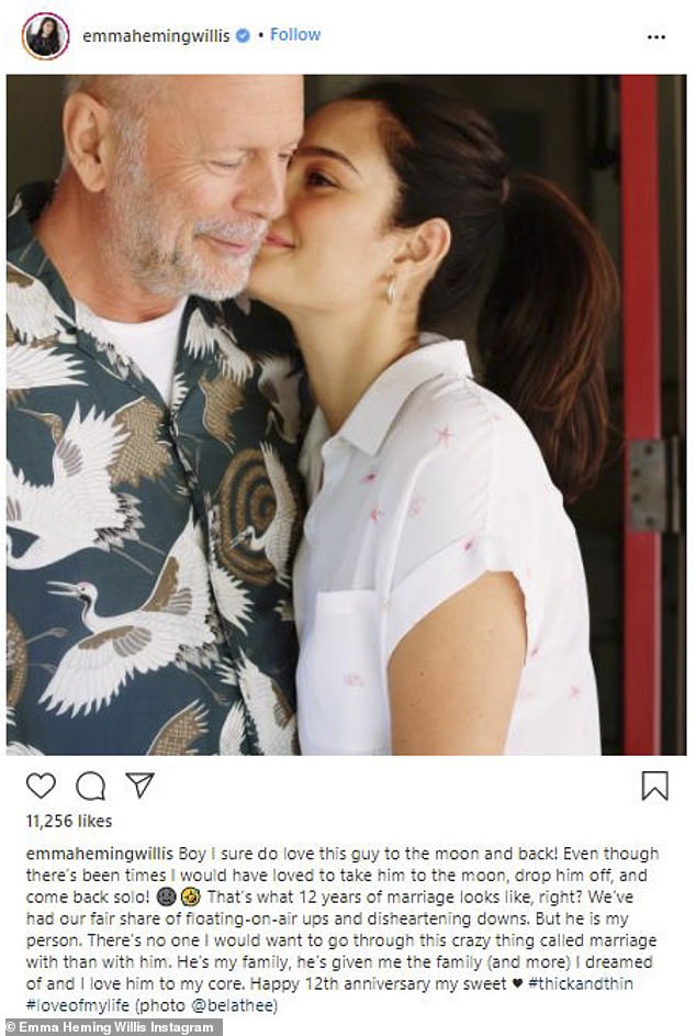 ونشرت صحيفة " ديلي ميل " البريطانية، أن إيما هيمينغ، 42 عاماً شاركت متابعيها على الإنستغرام صورة ومنشور لطيف للإحتفال بذكرى زواجها من الممثل الشهير بروس ويليز، 66 عاماً وقالت إن هذا ما يبدو عليه الأزواج بعد مرور 12 عاماً وأكدت إيما في منشورها على حبها الشديد لزوجها وتابعت إن زواجهما مر بالعديد من اللحظات السعيدة والحزينة وهناك أوقات تمنت أن تصطحبه للقمر وتتركه هناك وتعود أدراجها بمفردها ولكنها لم ترغب في المرور بكل هذا بدونه فويليس عائلتها ومنحها عائلة رائعة أكثر مما تمنت.