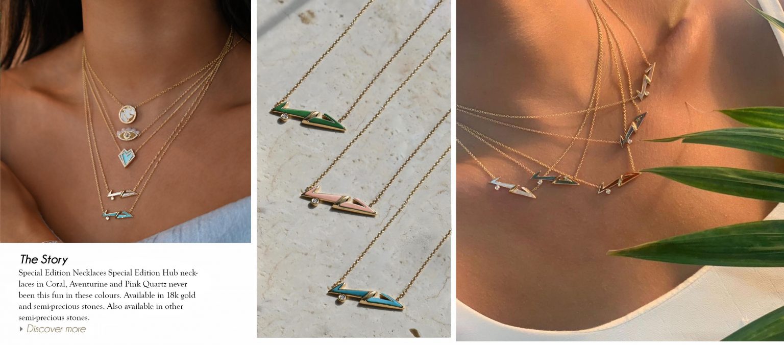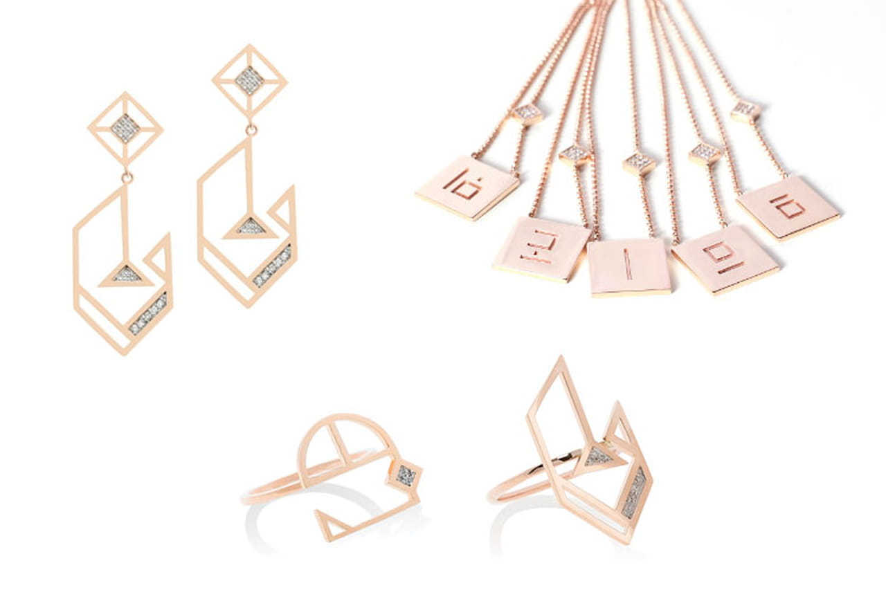 4. تعيد المصممة "شمسة العبار" ترجمة أسلوب الكتابة العربية التقليدية إلى أشكال هندسية تحترم قواعد طباعة الحرف، وتتكون سلسلتها من قطع صغيرة وواضحة من القلائد والأساور والأقراط وحتى الخواتم بلمسات راقية مرصعة بالألماس.