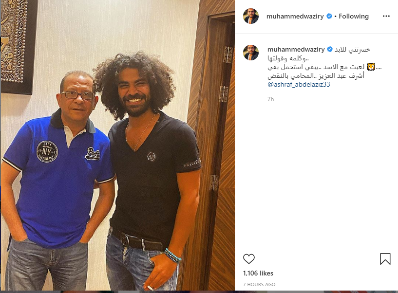 وجاء في تعليق محمد وزيري على صورته مع محاميه: "خسرتني للأبد وكلمة وقولتها.. لعبت مع الأسد يبقى استحمل بقى.. مع أشرف عبد العزيز المحامي بالنقض".