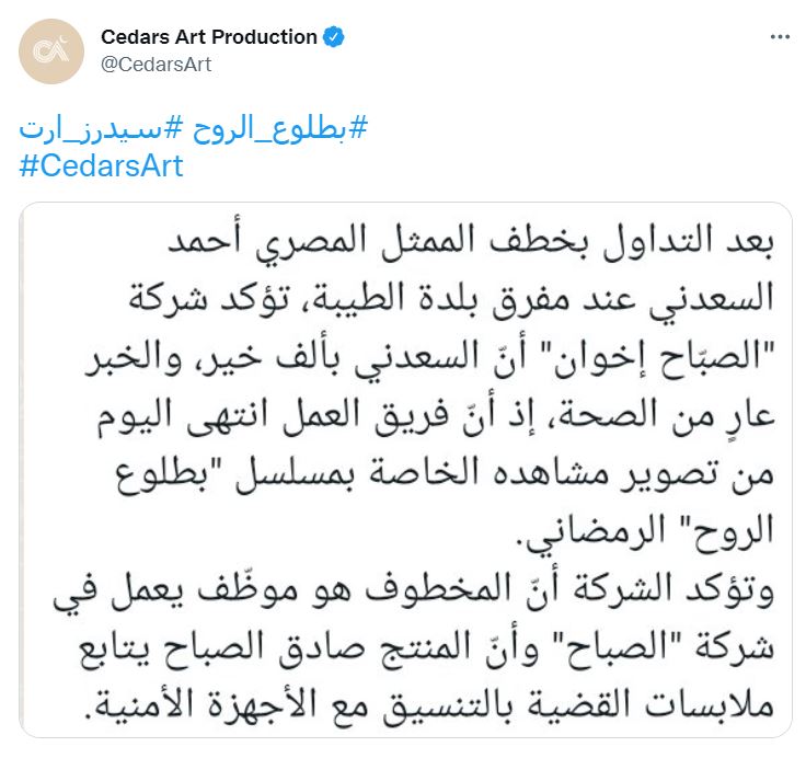 وجاء في بيان نشرته شركة الصباح المنتجة للعمل: "بعد التداول بخطف الممثل المصري أحمد السعدني عند مفرق بلدة الطيبة، تؤكد شركة الصباح إخوان أن السعدني بألف خير، والخبر عار من الصحة، إذ أن فريق العمل انتهى اليوم من تصوير مشاهده الخاصة بمسلسل بطلوع الروح الرمضاني، وتؤكد الشركة أن المخطوف هو موظف يعمل في شركة الصباح وأن المنتج صادق الصباح يتابع ملابسات القضية بالتنسيق مع الأجهزة الأمنية